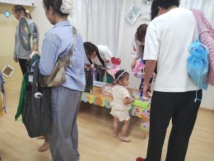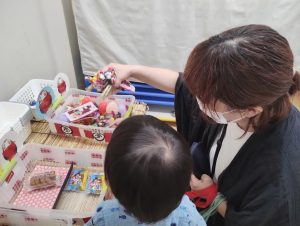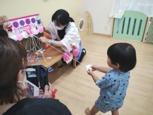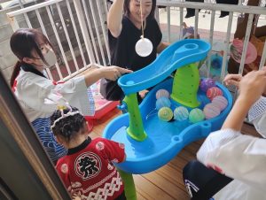 保護者の皆さんもお菓子のつかみどりやこよりのヨーヨー釣りの挑戦
