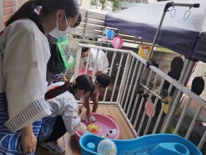 お玉でヨーヨー釣り。上手に釣れるかな。