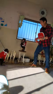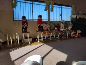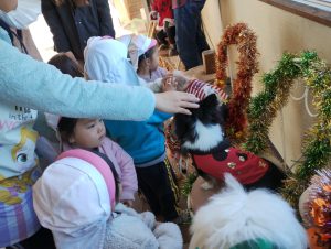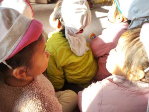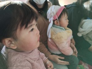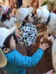 風が強く室内での開催になったので、至近距離でのお猿さんや犬さんに驚きながらも、怖がることなく真剣な表情で見守るみんなでした。