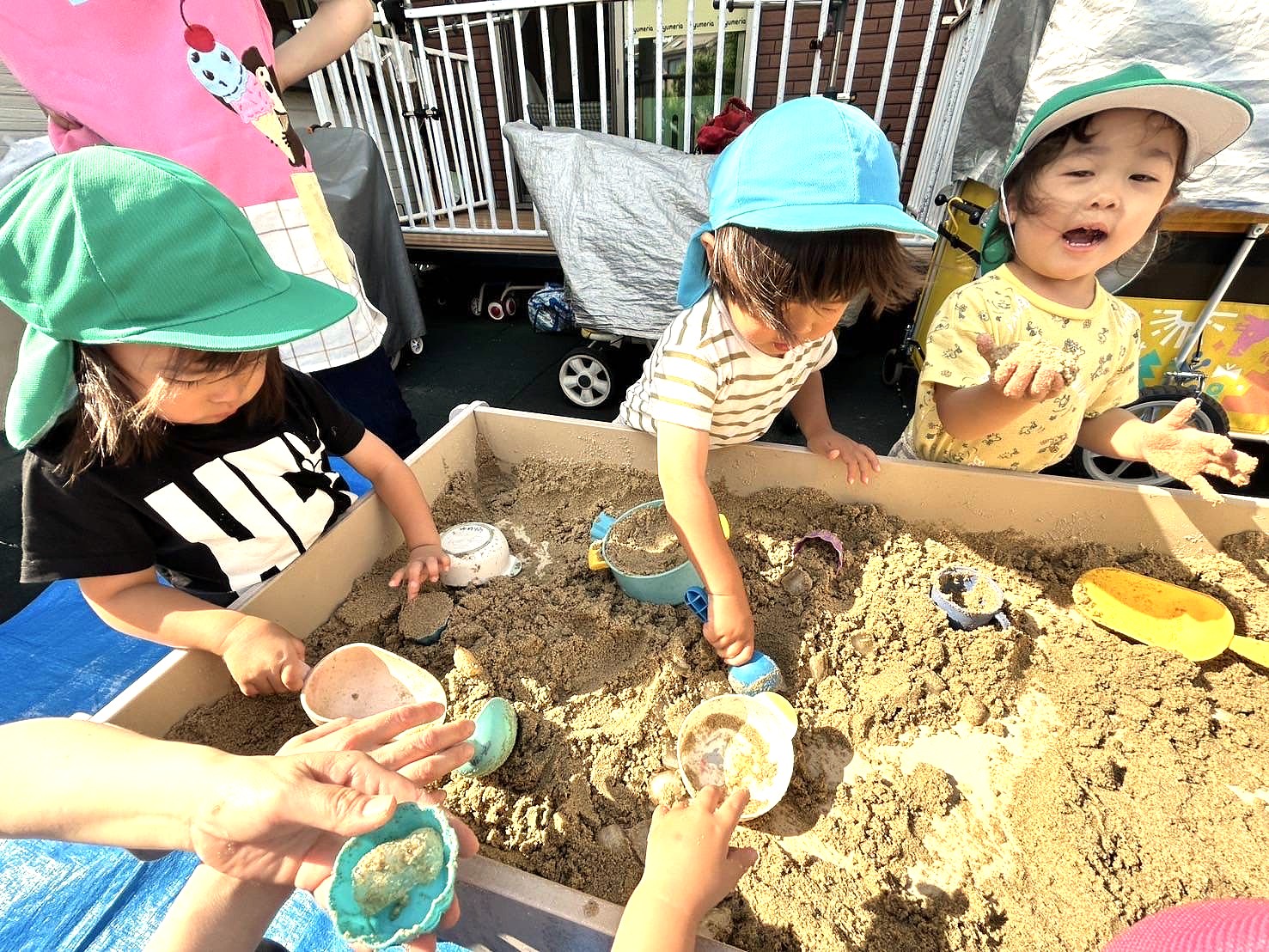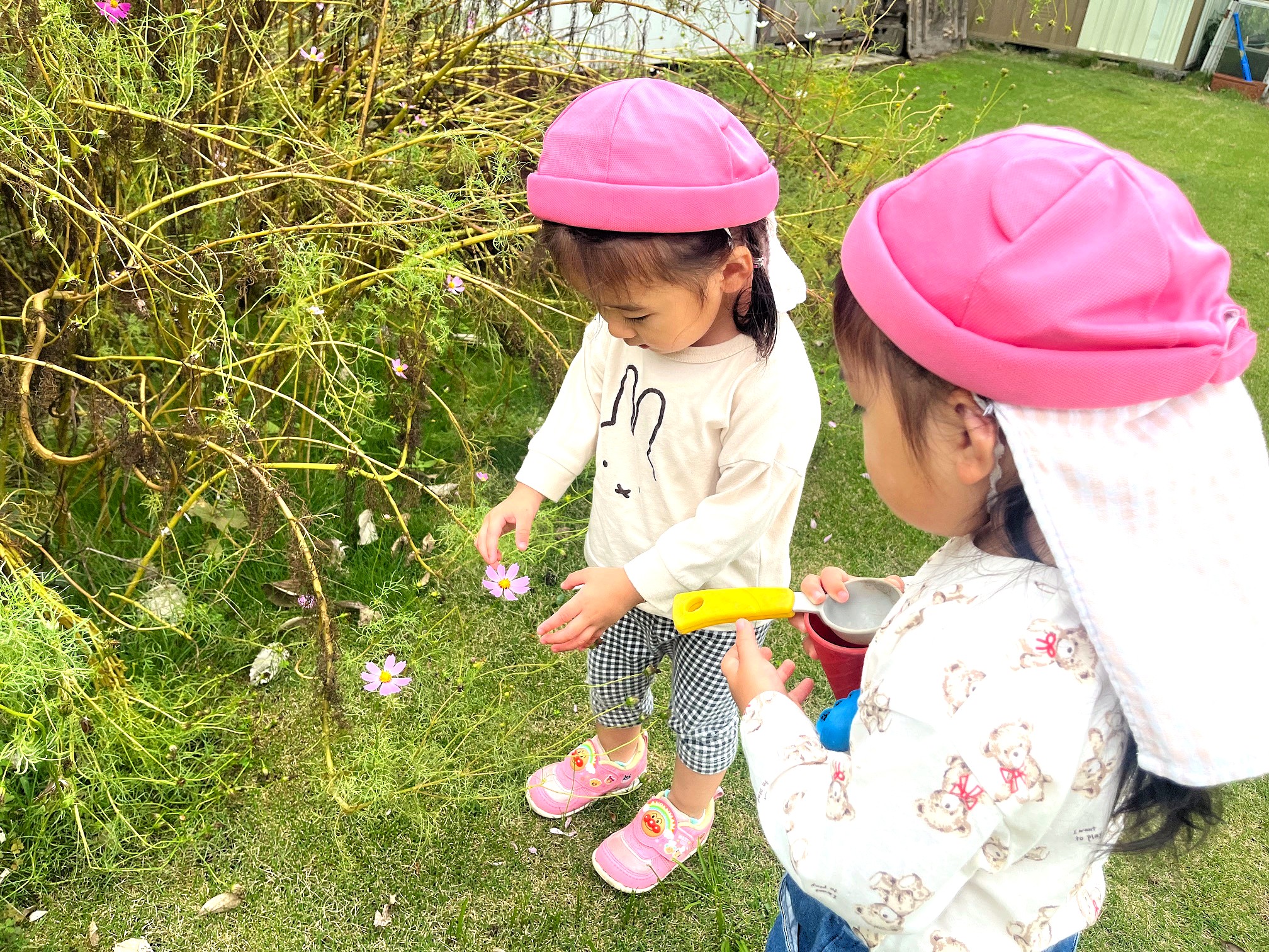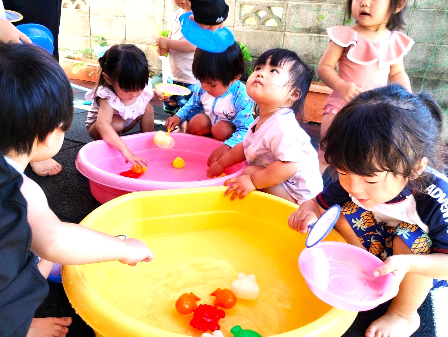 ゆめりあ保育園は小さなお庭が特徴の一軒家のような佇まい。このお庭は、夏にプール遊びの場所となり、夕暮れ時にもちょっとした遊び場となります。夏にプール遊びできる占有場所のあることが嬉しいし、夕方お迎えの遅いお子さんに気分転換できる時間を提供できることも嬉しい。玄関わきにあるこの小スペースが、長い一日を過ごす子どもたちの情緒の安定にひと役かっているのです。