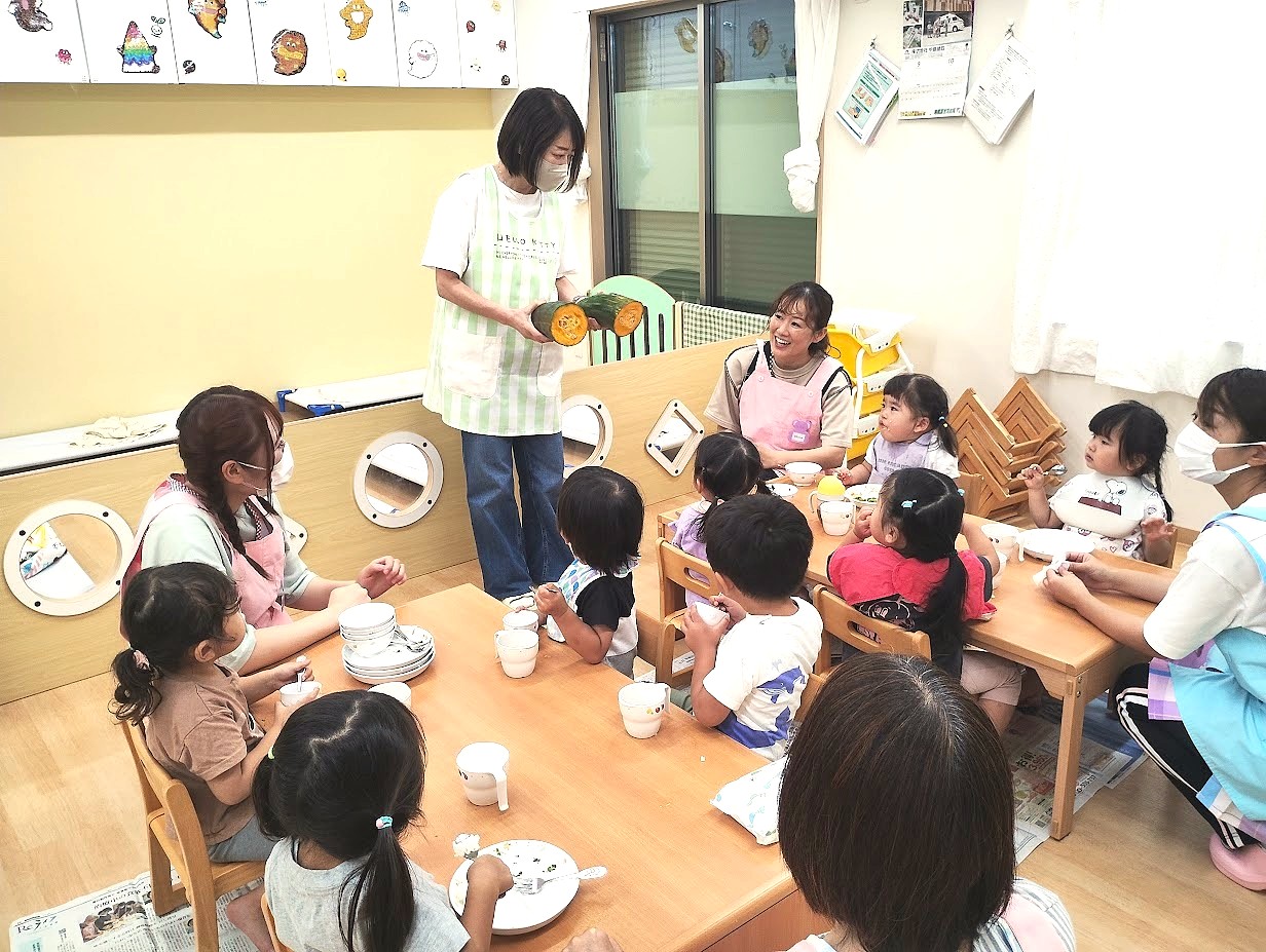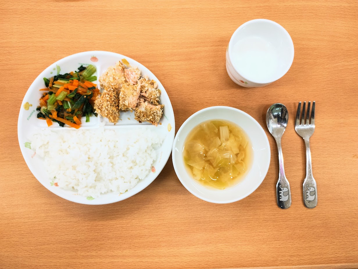 肉・魚・野菜など基本食材は国産のものを使用し、特にお野菜は冷凍ではなく生鮮のものを仕入れています。お米は岩手の産直農家さんから毎月精米したてを送ってもらっています。「全ての食材をオーガニックに…」とまではいきませんが、子どもたちの体の中に入るもの、栄養は、できる限りこだわっていきたいと考えています。同じフロア内にあるキッチンから出来立てを提供しますので、ぬくもりを感じる温かな給食が子どもたちを毎日笑顔にしてくれます。